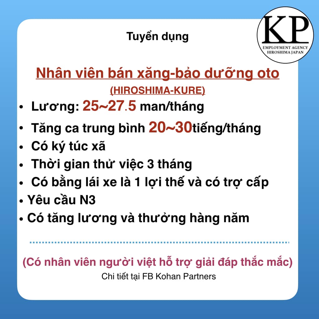Tuyển Dụng miễn phí: Bảo dưỡng Ô tôĐịa điểm: HiroshimakenLương cơ bản: 20~ 23man…